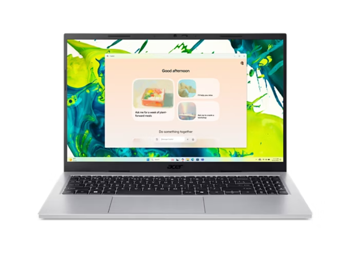 Aspire Go 15 (AG15-72P-54XT) – Windows 11 Home – Intel® Core™ 5 processor 120U8 GB DDR4 Memory + 8 GB DDR4 Memory – 512GB PCIe NVMe SSD PM4 + N/A – 15,6″ FHD 1920×1080 IPS Anti-Glare 300nits – Intel® Graphics  – Wifi 6 802.11AX 2×2 MU-MIMO ICPS + BT 5.0 – FHD USB TNR Camera with 2Mic. with camera shutter – 2x USB Type-C™ port supporting: USB 3.2 Gen 2 (up to 10 Gbps) / DisplayPort over USB-C / USB charging 5 V; 3 A / DC-in port 20 V; 65 W – 2x USB 3.2 Gen1 – HDMI 2.1 – Acer Sense App – Copilot Key – 53Wh Li-ion battery – 65W USB Type-C AC Adapter PCR50% TCO9.0 – Pure Silver